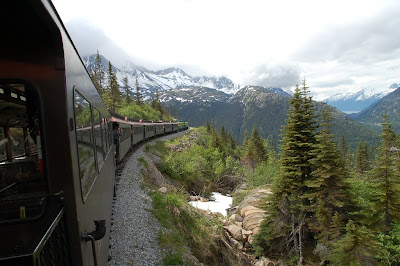 While in Whitehorse, we found out that we could make arrangements with a bus/train combo to get to Skagway & back to Whitehorse. So we boarded the bus to take us to Fraser to board the train to Skagway. Normally we would have boarded the train at Carcross, but some of the tracks had been destroyed by a major landslide in May and had not been repaired completely. So we had to ride further south to Fraser.