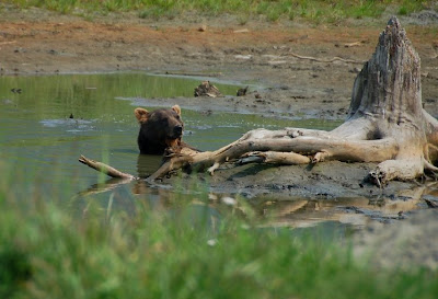 This bear was just coming out of the swamp or small pond beside the road when we were driving by. It was near the Russian River where we had just walked along side the bank looking for bears. The fishermen on the opposite bank yelled at us to warn us there were two bears fishing just around the corner of the river in the direction we were walking! Bears do not like to be surprised and neither do we so we turned around!.